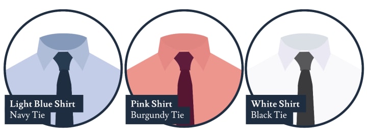 Ideally, your tie should always be darker than your shirt if you want to strike the perfect complementary balance. So, to match a cool-coloured shirt and tie, you would pair a navy coloured tie with a light-blue shirt. Similarly, a burgundy tie would match well with a pink shirt.