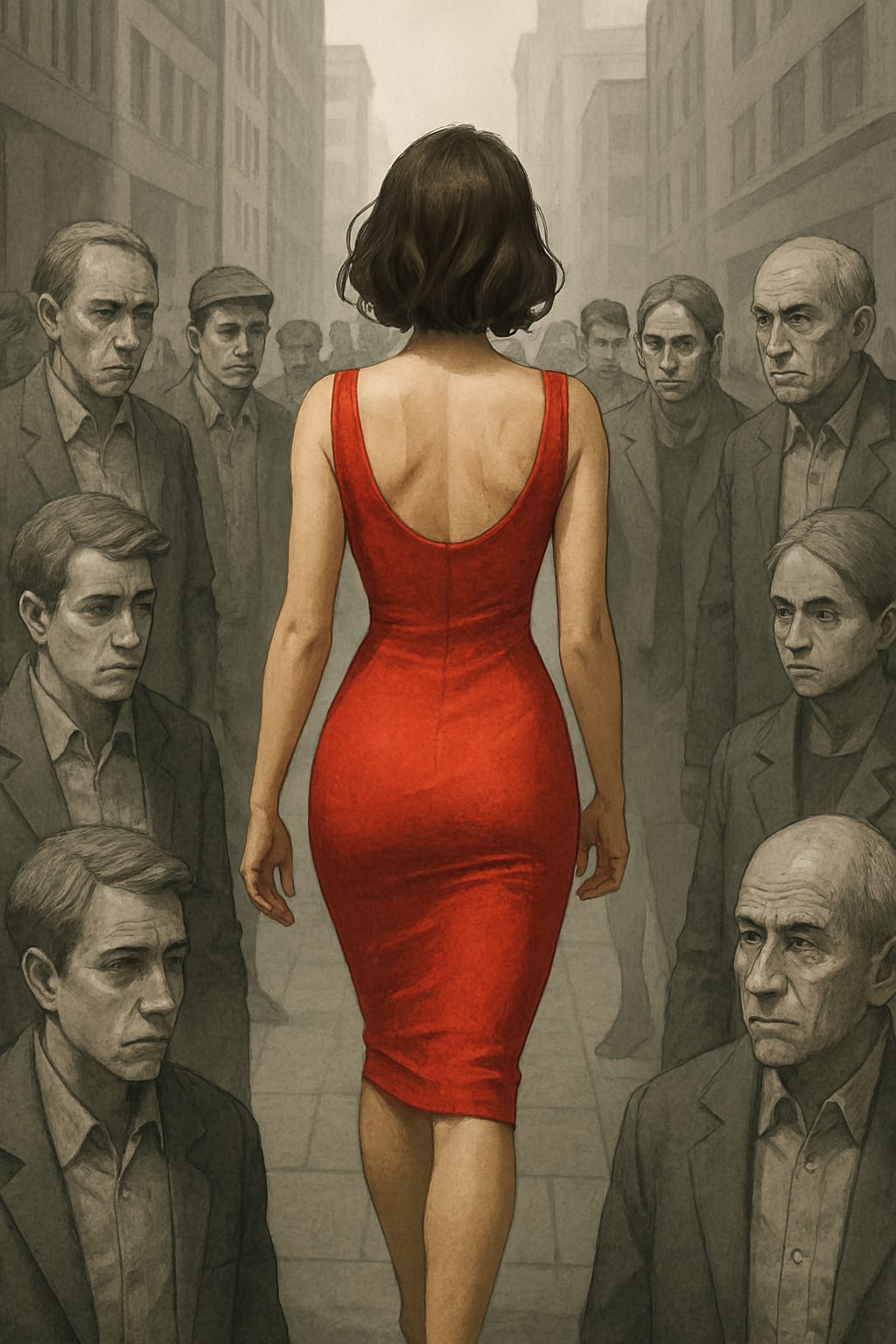 Anna walked down the street, her step light but determined, when a shop window completely caught her attention. A dress, draped over a mannequin, sent her a promise of elegance. It was a red dress, smooth, fitted, with a neckline barely suggested, but enough to make it seem like the perfect mix of sensuality and sophistication. Anna paused for a moment, drawn to the dress, but immediately a doubt crept in: "This dress is very sexy, my husband certainly won't be happy if I wear it without him... better leave it here."