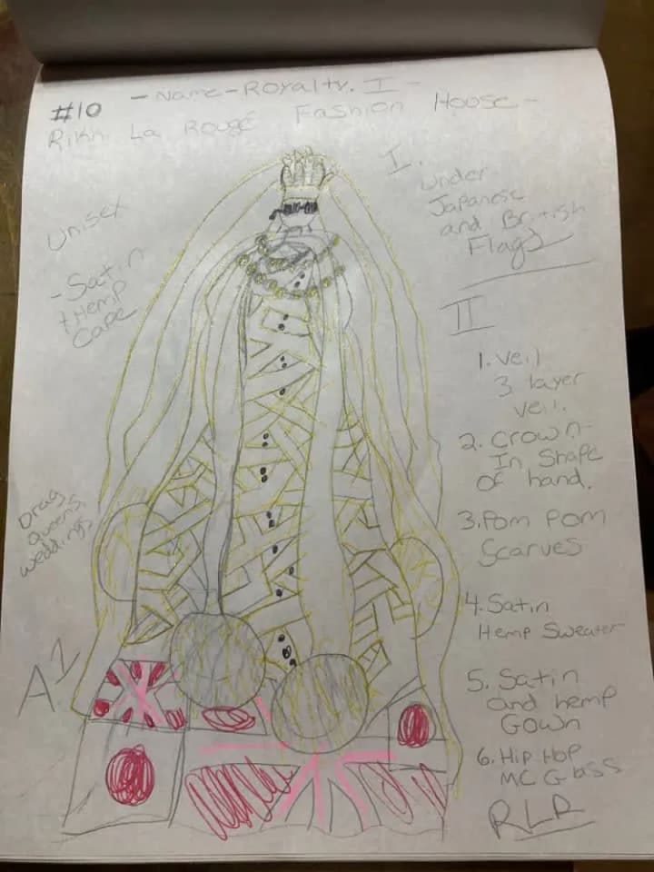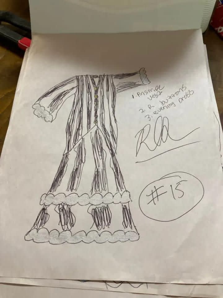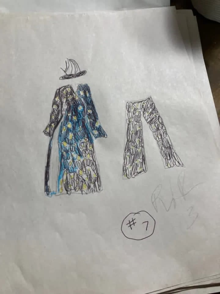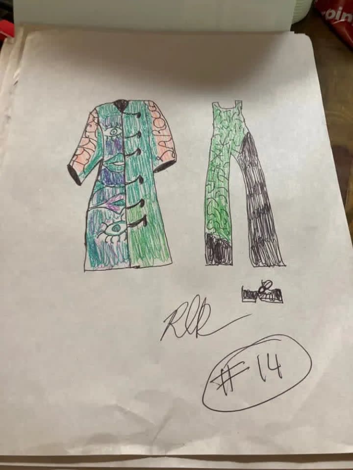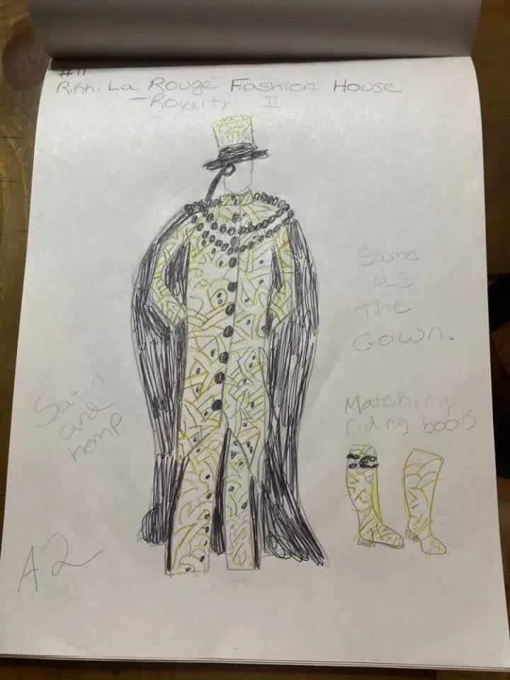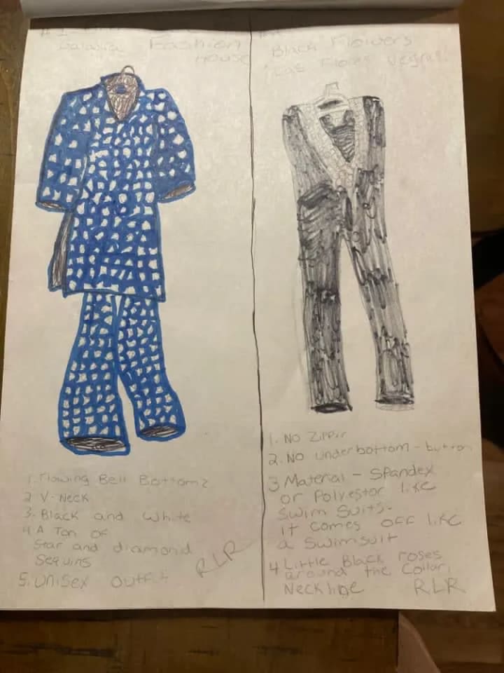The blue suit with all of the cuquins and stars is a variation of one of the first fashion designs I had ever created. The original was done on the bus going home from school one afternoon. The outfit next to it is in black and it is a black jumpsuit i made out of a costume dress. It is actually the only piece I had ever made and was able to wear it. I took a pair of jeans and did the bottoms like that and I sawed it up by hand and it came out looking very good. Doing that piece was the only time I had ever made one of my designs wearable in the real world. My fashion house is dedicated to Prince and Gianni Versace who were my entry into the world of fashion.
