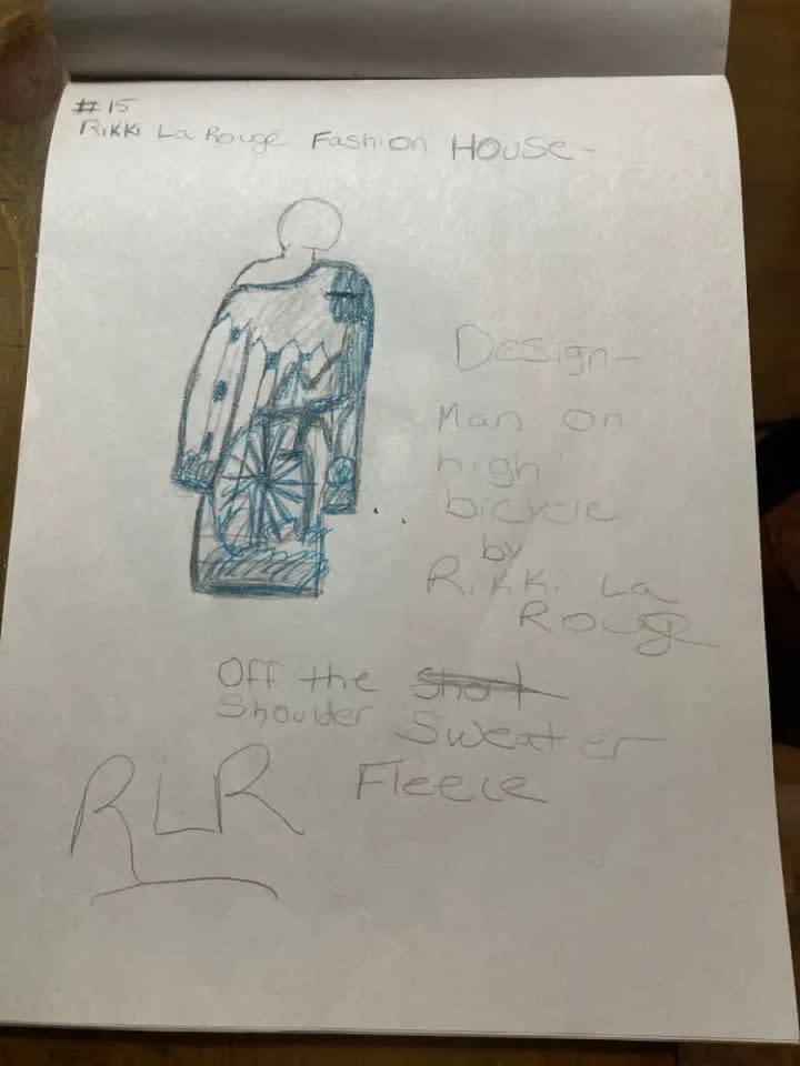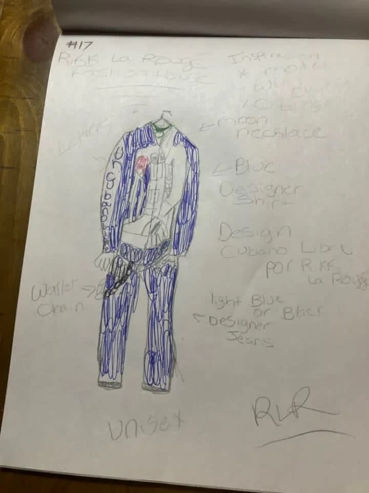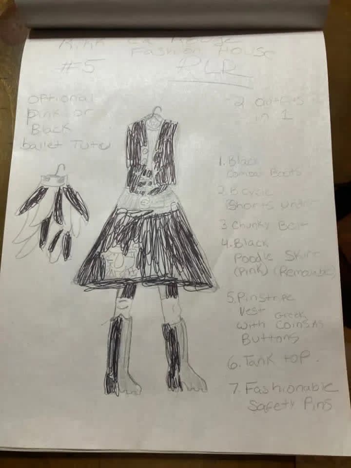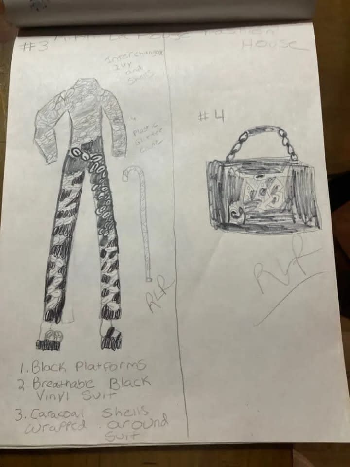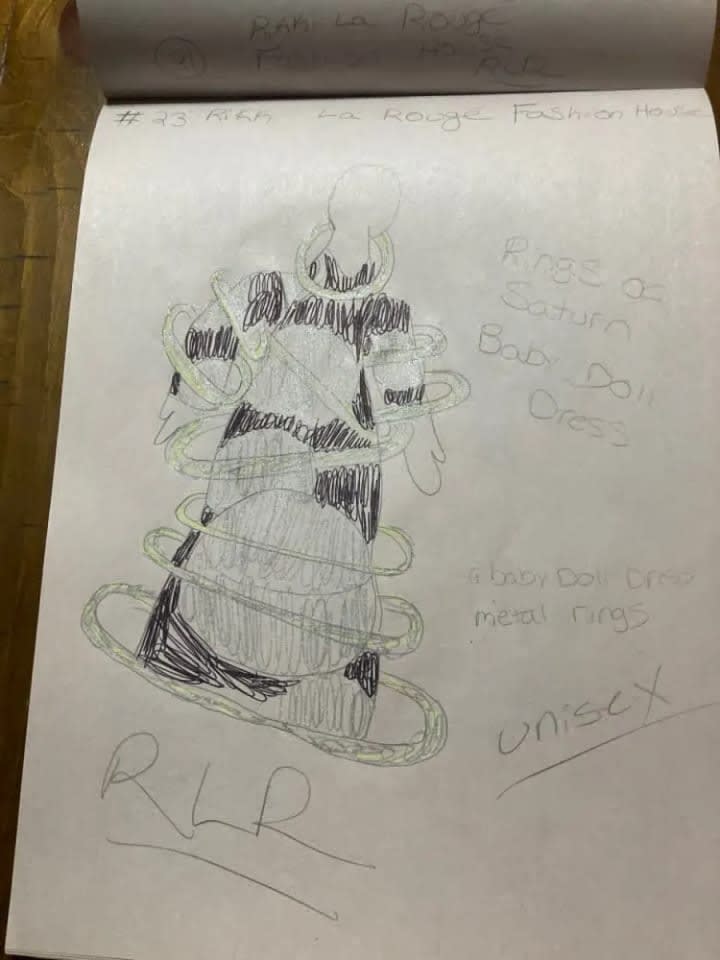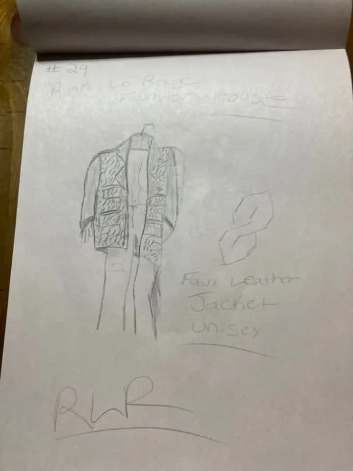 The blue suit with all of the cuquins and stars is a variation of one of the first fashion designs I had ever created. The original was done on the bus going home from school one afternoon. The outfit next to it is in black and it is a black jumpsuit i made out of a costume dress. It is actually the only piece I had ever made and was able to wear it. I took a pair of jeans and did the bottoms like that and I sawed it up by hand and it came out looking very good. Doing that piece was the only time I had ever made one of my designs wearable in the real world. My fashion house is dedicated to Prince and Gianni Versace who were my entry into the world of fashion.