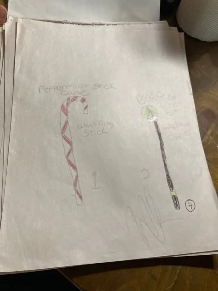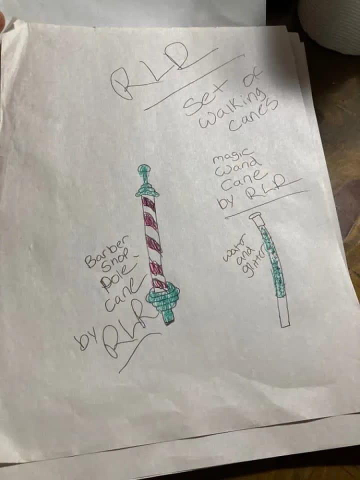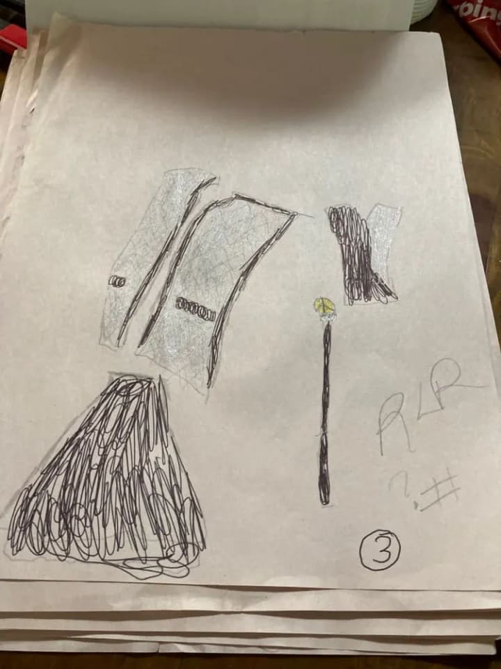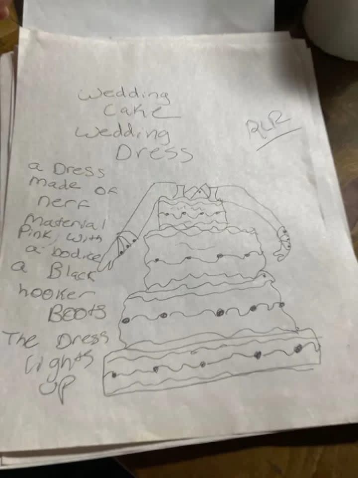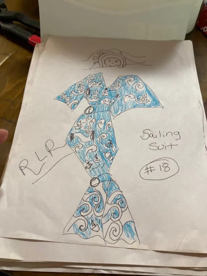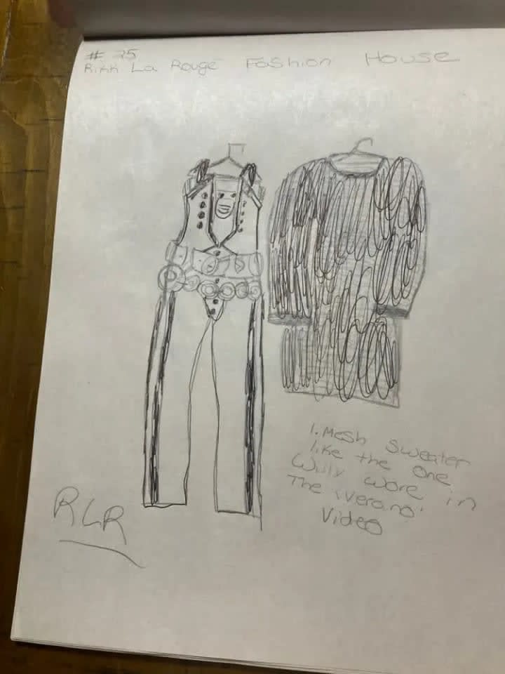 The blue suit with all of the cuquins and stars is a variation of one of the first fashion designs I had ever created. The original was done on the bus going home from school one afternoon. The outfit next to it is in black and it is a black jumpsuit i made out of a costume dress. It is actually the only piece I had ever made and was able to wear it. I took a pair of jeans and did the bottoms like that and I sawed it up by hand and it came out looking very good. Doing that piece was the only time I had ever made one of my designs wearable in the real world. My fashion house is dedicated to Prince and Gianni Versace who were my entry into the world of fashion.