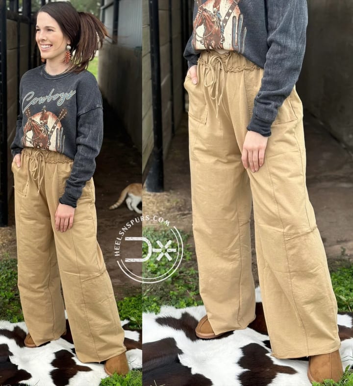 The drawstring detail adds an extra touch of comfort and allows you to adjust the fit according to your preference. Whether running errands or grabbing a cup of coffee with your girl best friends, these wide-leg pants from a Western boutique collection are your go-to choice for an effortless day.
