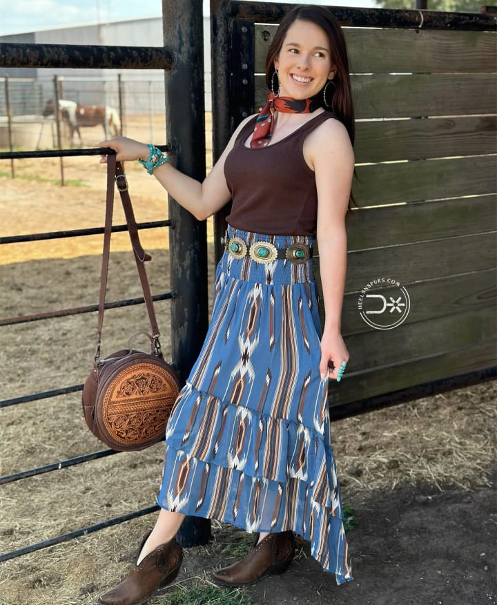 Achieve a chic and effortless look by pairing a western skirt with a simple and beautifully colored tank top. Combining these two wardrobe staples creates a stylish and feminine outfit for various occasions. To elevate your cowgirl-inspired look, accessorize with a bandana tied around your neck and add a belt to accentuate your waist.