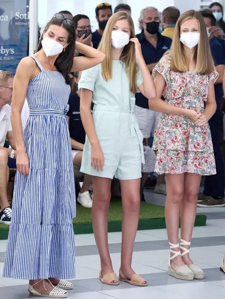 During their vacation, they visited the sailing club in Palms DE Mallory and Princess Leonor wore a Zara floral dress and hemp-soled shoes. Princess Sofia wore short one-piece shorts, and sandals, using the shorts to show off her legs, which were indeed beautiful.