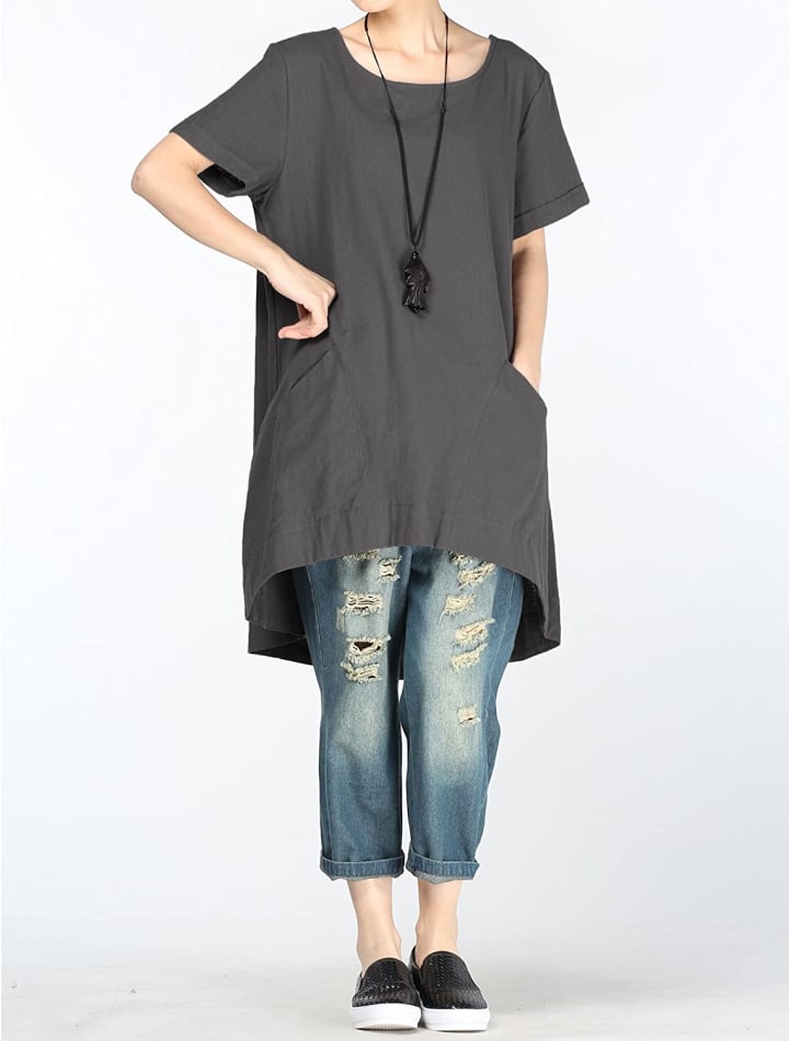 Mordenmiss Women's Cotton Linen Tunic Tops Hi-Low Dresses with Pockets
