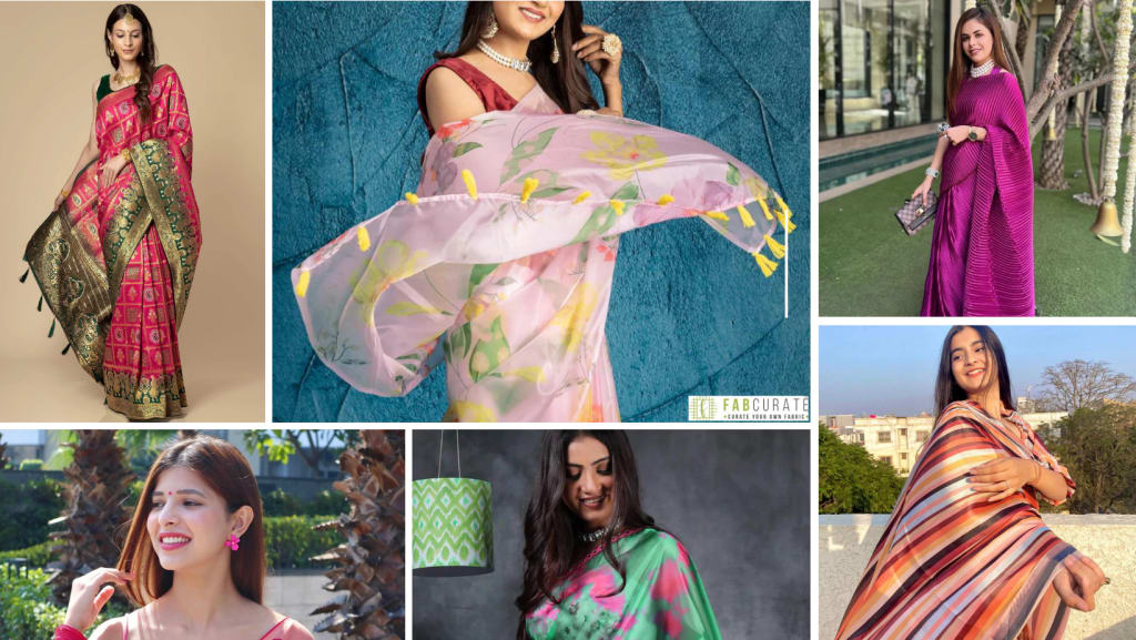Sarees for Holi come in a variety of styles. From light and airy textiles for a casual daytime appearance to heavy embroidered and embellished sarees for evening celebrations, there is something for everyone. Women may embrace the Holi spirit by donning lovely hues like yellow, green, pink, red, and orange. Women can accessorize their sarees with traditional jewelry like necklaces and earrings to create the perfect festive appearance. You may choose from a variety of sarees and blouses in Fabcurate's saree selection to exactly complement it. Moreover, customization is an option, giving you the ability to choose any fabric and any pattern of your choosing.