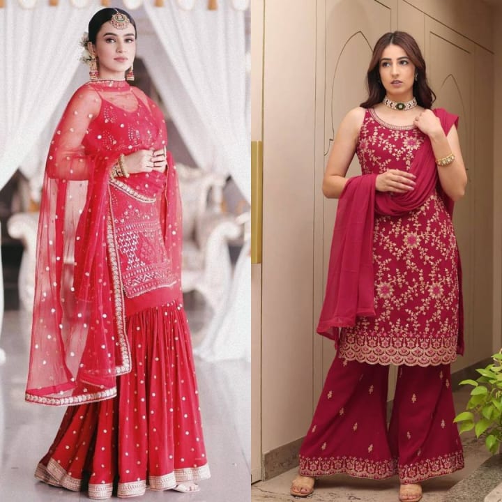 Sharara-style Pakistani dresses have become a big trend in recent years. This design includes a short or mid-length kameez paired with wide-legged sharara pants that have a flare starting at the knee. Sharara-style salwar kameez is perfect for weddings and grand occasions as it gives a royal and glamorous look. It is usually paired with heavy embroidery and embellishments, making it a standout outfit.