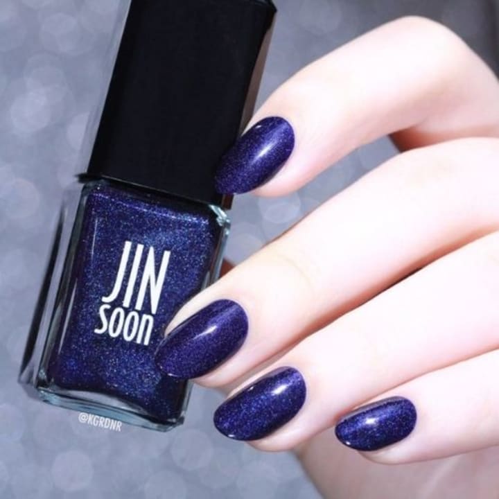 This classic deep blue color always gives you a very classy look and never goes out of style. That color goes with every occasion. That nail color is enhanced with galaxy- like spaces that provide a subtle stardust quality.