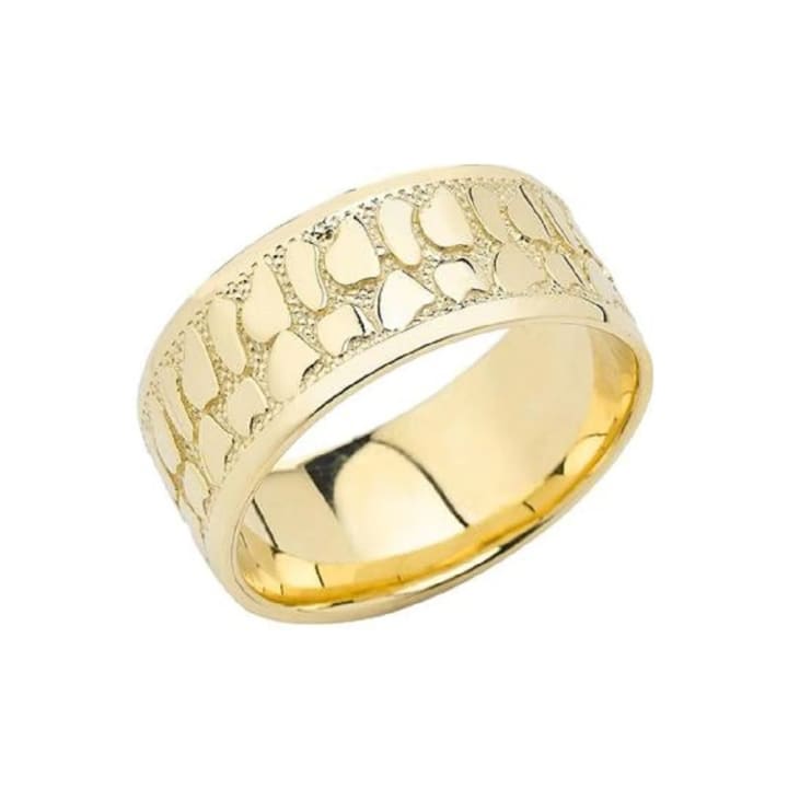 This yellow gold nugget band showcases utter artistic brilliance. The traditional yellow color and nugget gold is a dream combination that acts as an attention catcher. Be it a date night, or a casual event, this band shines on all occasions. You can consider gifting this artistic gold band on a special occasion in order to impress your partner like never before.