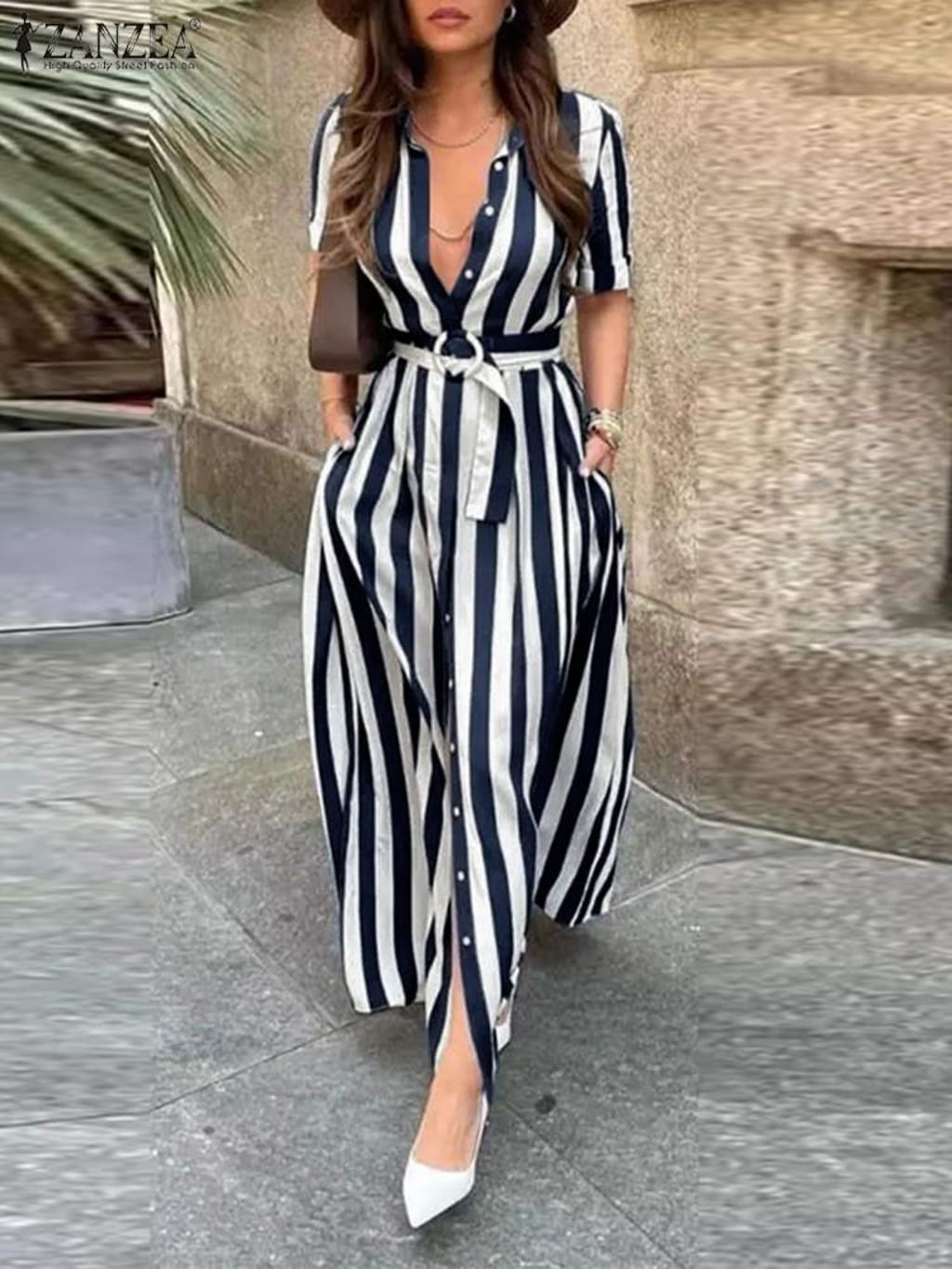 For a classic and timeless look, opt for this striped midi dress. The nautical-inspired design and flattering silhouette make it a versatile choice for both casual and semi-formal occasions. The stretchy cotton blend ensures a comfortable fit throughout the day.