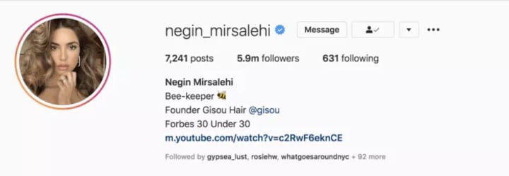 Negin is a Dutch fashion influencer with over 5.5 million followers on Instagram and over 326,000 YouTube subscribers. She has worked with some of the most notable fashion, including her partnership with Express x Negin Mirsalehi. Negin is also the founder of Gisou Honey, and Infused Hair Oil with an exclusive oil enriched made with honey from the Mirsalehi bee garden.