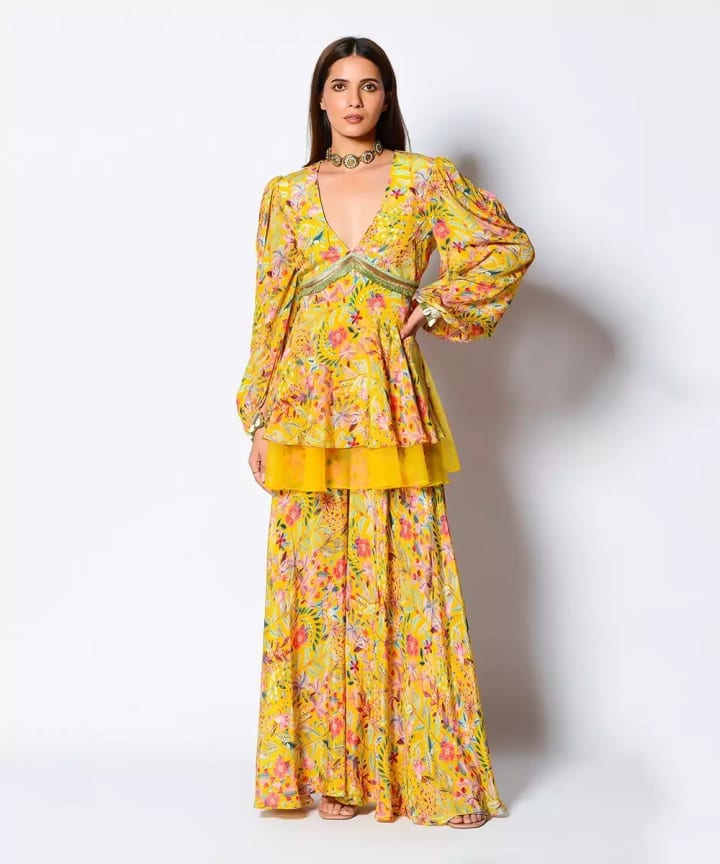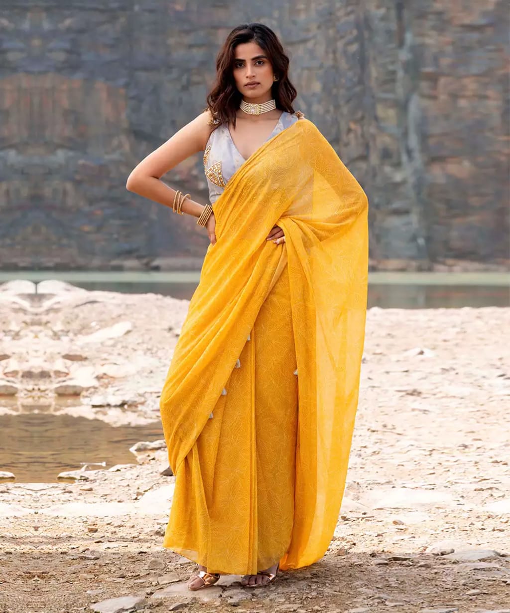 If you love sarees, then a light floral printed saree can be your go-to haldi dress for women. Fabrics like organza, georgette, or cotton silk work well for this function. The best part? They are easy to drape and carry during all the haldi fun and dance!