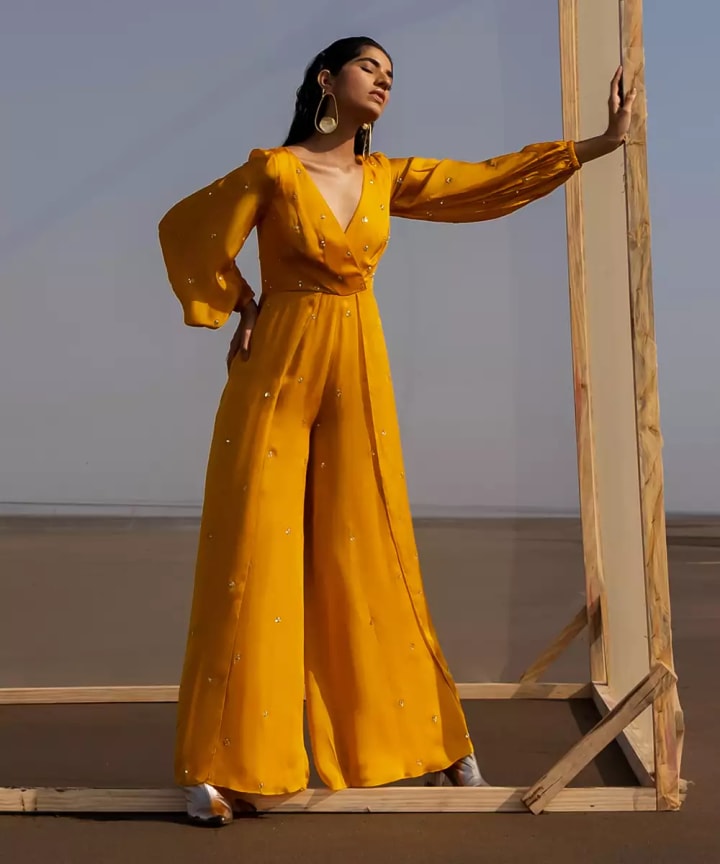 Capes add drama to your outfit. A yellow cape with a crop top and palazzo or skirt gives you a modern yet festive vibe. Bridesmaids and even brides who like something edgy can try this trend.
