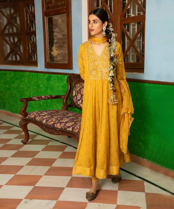 Anarkali kurtas are flowy, elegant, and make you look graceful. A soft yellow or mustard haldi dress for bride with embroidery on the sleeves or neckline is trending for 2025 weddings. These outfits also work great for Haldi functions hosted outdoors.