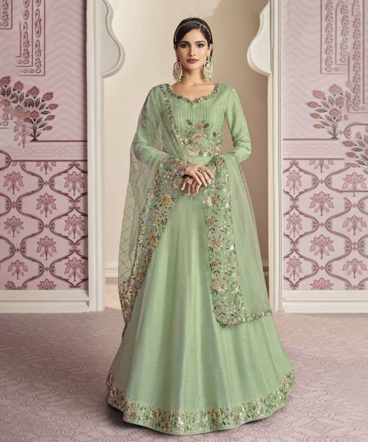 Heavy Silk Anarkali dress for the sangeet ceremony: - Giving a farewell and wishing luck to the bride is one of the aspect that families and friends do. With happiness and joy sangeet ceremony is conducted to wish good luck to groom and bride before the wedding rituals. If you wish to maintain the old world charm and maintain a clean look then this style is for you. To accentuate your feminine charm you could go well with the neat hairdo and accessorize it well.