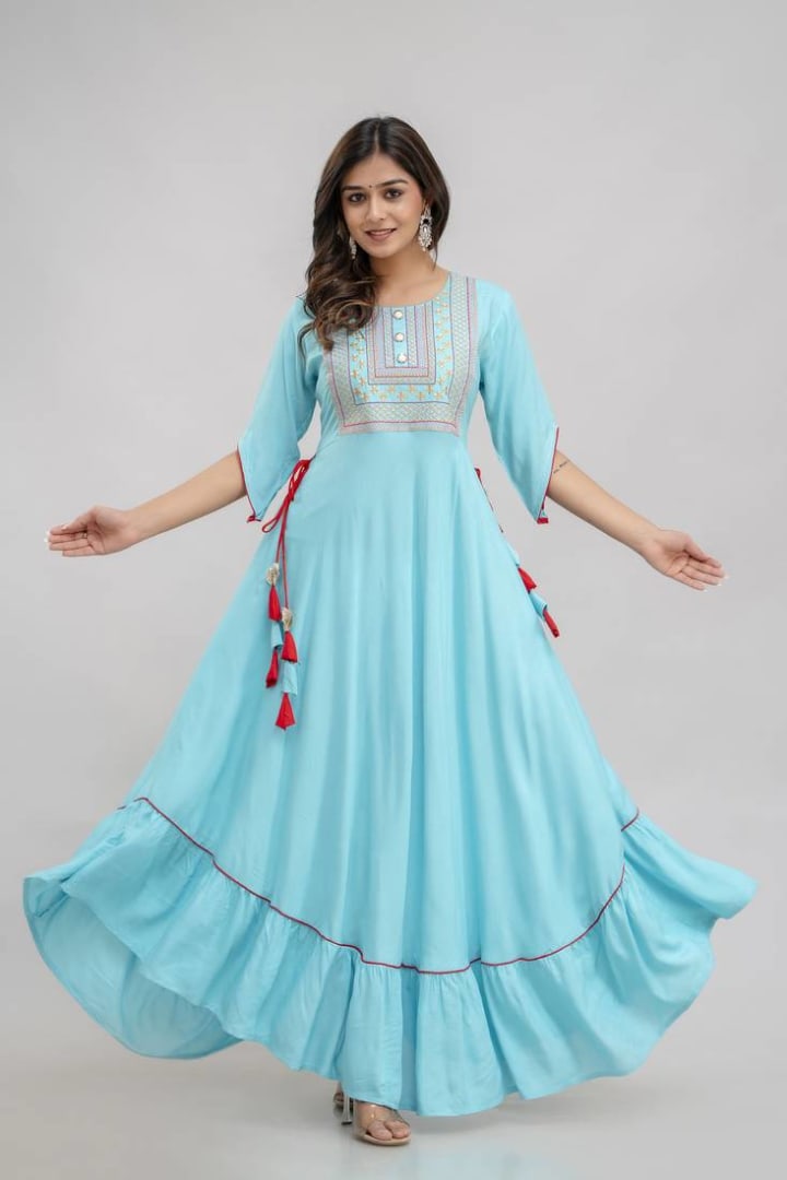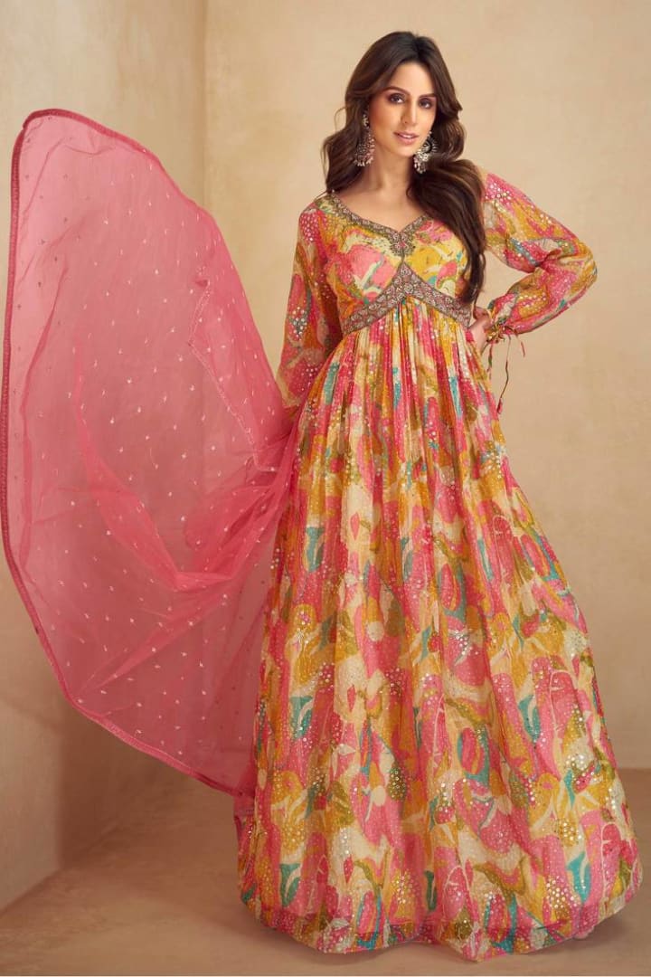Printed Anarkali gowns for reception party: - Admit it girl that now someone else will occupy your space and your bff will be his forever. But happily bidding her farewell is all you can do at this happy moment. Even at the reception your wardrobe should be extremely special like other functions. when you wish to ditch that duppatta and make your fashion statement extremely quirky then selecting printed gowns will do all that wonders. The fascinating prints all over the suits will simply one up your fashion game. The receptions are basically done to invite the new beginnings and bless the couple with love. These functions are usually conducted during night time therefore you could go for dark color base suits. The online store gives complete leverage of selecting suits as per your skin complexion and choices.