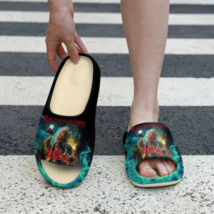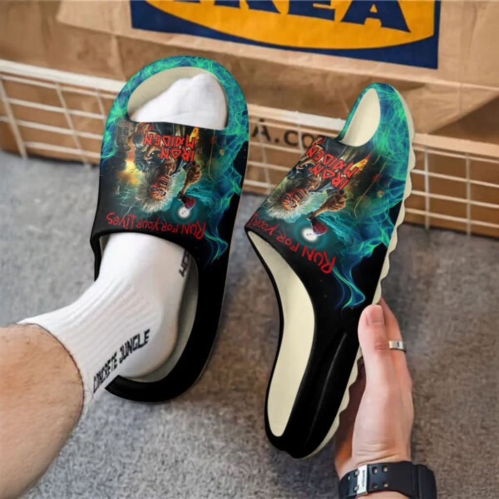 Getting the Iron Maiden "Run For Your Lives" Yeezy Slide is not just a purchase but a declaration of allegiance to one of the greatest heavy metal bands. Not just comfortable footwear, these slides are a unique fashion statement, blending traditional metal aesthetics with contemporary comfort and style. They allow fans to express their relentless devotion to Iron Maiden in a unique way, whether lounging at home, heading to the pool, or making a statement for casual outings. A unique and eye-catching addition for dedicated collectors of band merchandise, these slides pay tribute to the enduring legacy of Eddie and Iron Maiden's thrilling world.