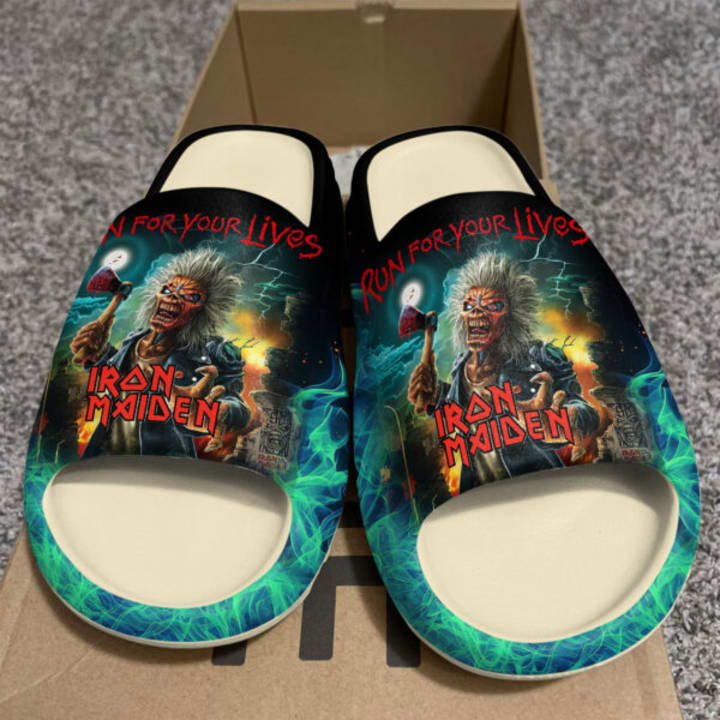 Iron Maiden has been an unstoppable force in the world of heavy metal for more than forty years, exciting millions with their epic stories, complex guitar harmonies, and the sheer energy of their live shows. At the forefront of their legendary status is Eddie, the band's iconic, ever-evolving mascot, whose snarling visage has graced hundreds of album covers and tour posters. Now, the spirit of the beast is unleashed on a new canvas of wearable art with the Iron Maiden "Run For Your Lives" Yeezy Slide, a bold convergence of metal aesthetics and contemporary comfort that refuses to be ignored.