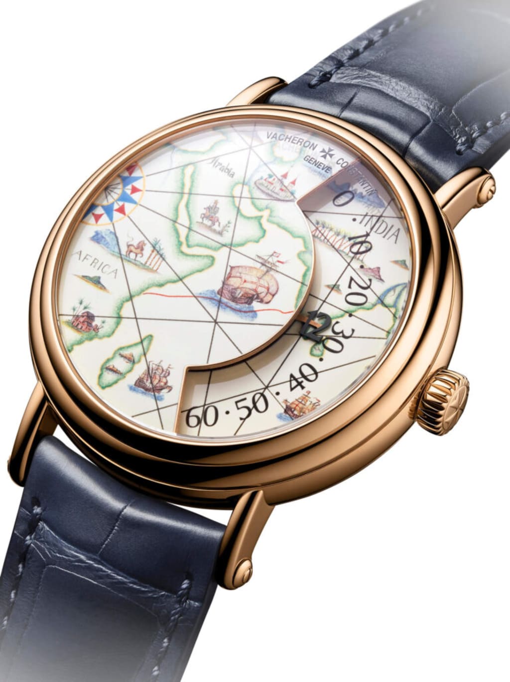 Take a close look at the dials and you’ll see the level of detail possible with miniature fire painting. Red lines trace each voyager’s path, as ships flying billowing flags sail past continents. Each continent’s indigenous wildlife is deftly depicted on the dial. You can also see the silhouettes of crew members and the individual feathers of birds. The wind rose, a crucial navigational tool, guides the fleet in colourful glory on the left of the dial.