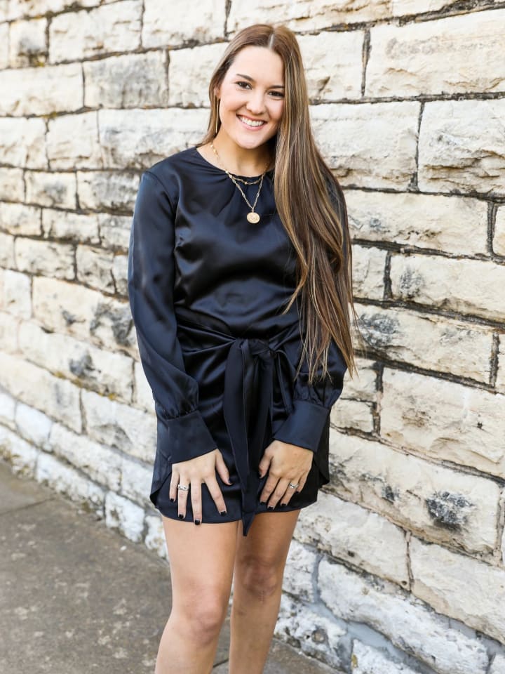 The satin halter dress makes you look like a million bucks, and it is perfect for V-Day. It follows your curves all the way down to the right above the knee, making it a perfect Valentine's Day dress.