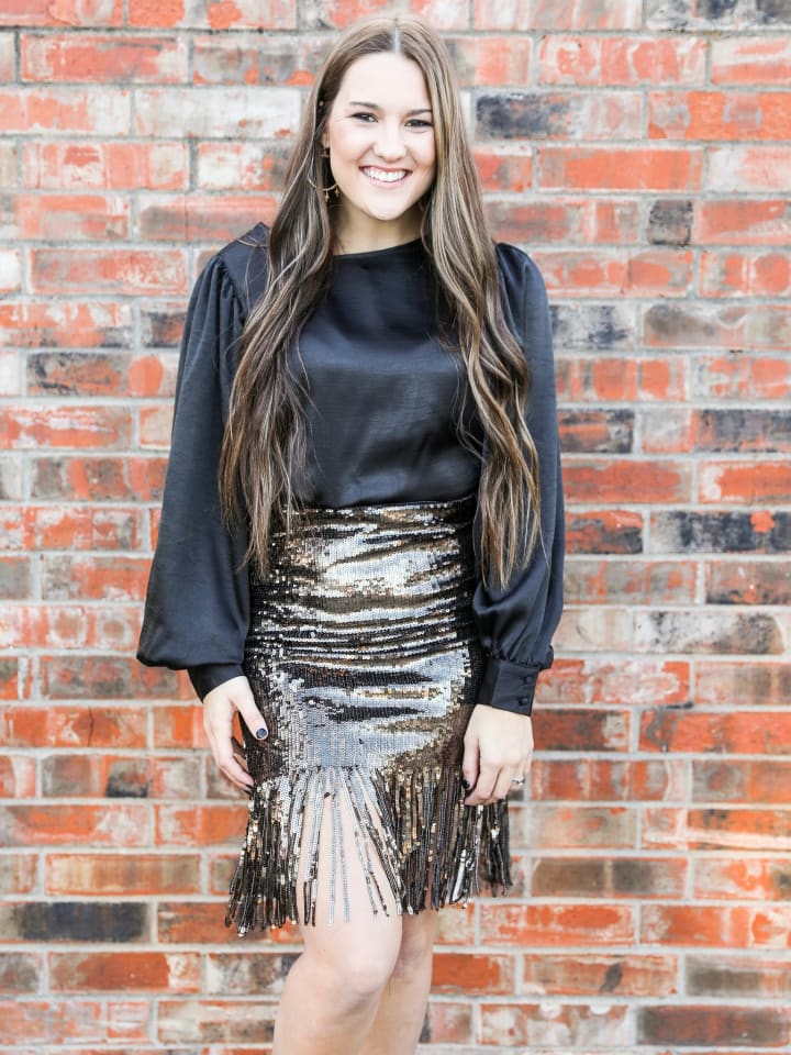 The sequin skirt adds a fun twist to an otherwise simple outfit. You can add a cute crop top or even a sweater to this look! The shiny black puffy sleeves are super cute and will catch your man's eye. You can do your hair in a simple ponytail or leave it down for an even classier look.