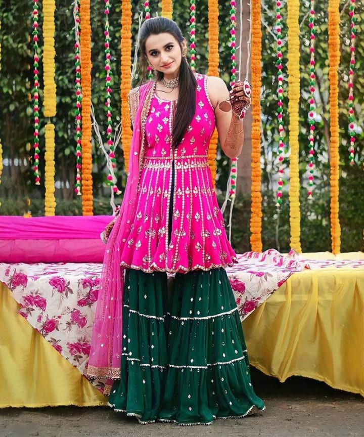Many believe that the sharara suit is inspired by the Mughals. However, not many know that the sharara suit is also an important part of Punjabi culture. The flared bottoms and short kurti look elegant and fun at the same time. When you walk, the fabric flows so beautifully that it catches everyone’s attention. It is a lovely pick for weddings or festive evenings especially for new brides.