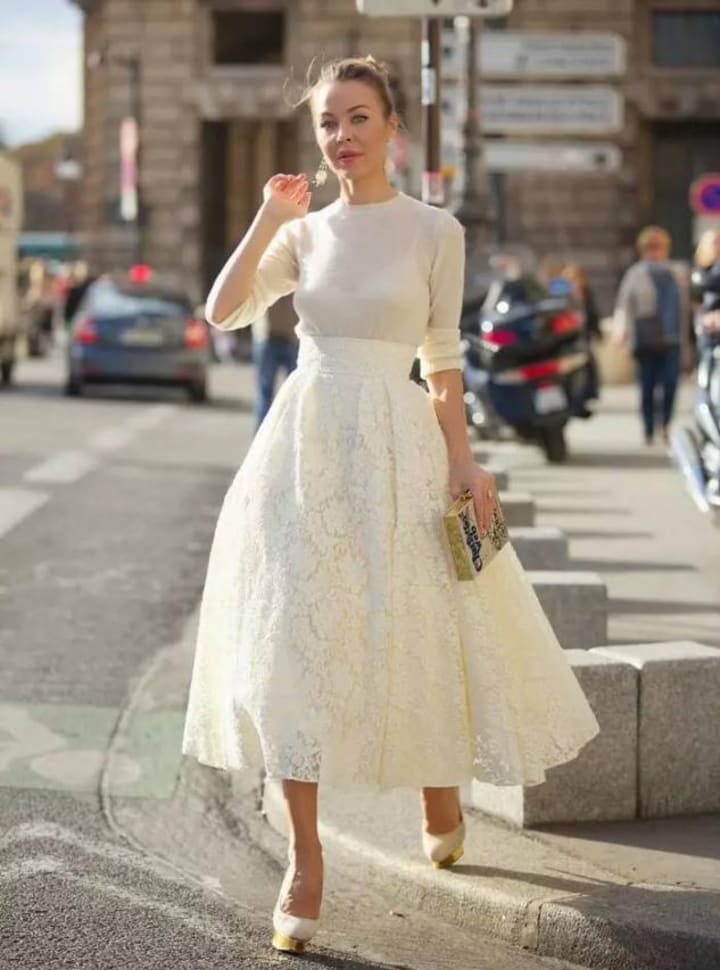 High waist style umbrella skirt selection fabric must be on the heavy side, such as tweed fabric or corduroy skirt will look more warm feeling, the more floating fabric will look fat, high waist umbrella skirt with short tops is the most obvious proportion of the body, over 45 years old women pick umbrella skirt color bias solid color system will be more elegant.