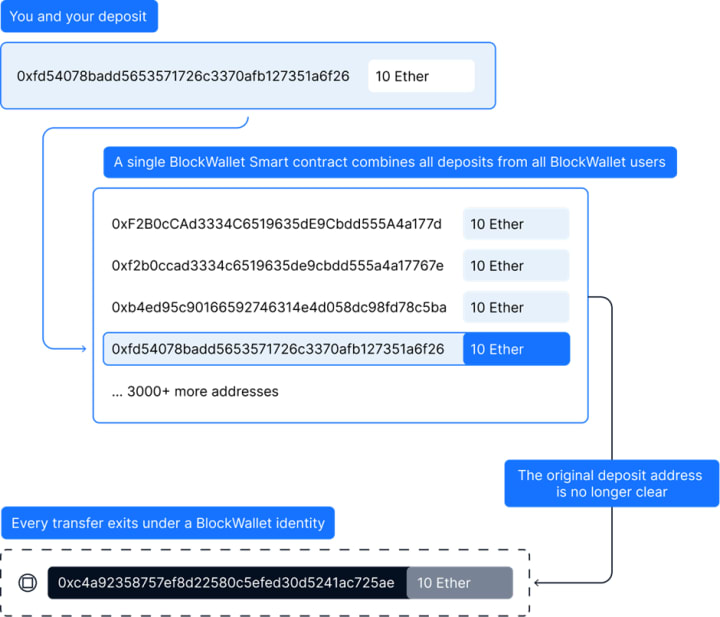 BlockWallet uses Cryptographic proofs (zk-SNARKs) to allow users to make deposits and withdrawals using smart contracts that render funds untraceable. You can use BlockWallet to transfer funds to an address with no links to your history on the blockchain. All the while making the experience easier and easier to achieve.