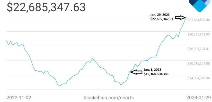 Bitcoin mining revenue jumped from $15.3 million on Jan. 1 to nearly $23 million in the span of 30 days.