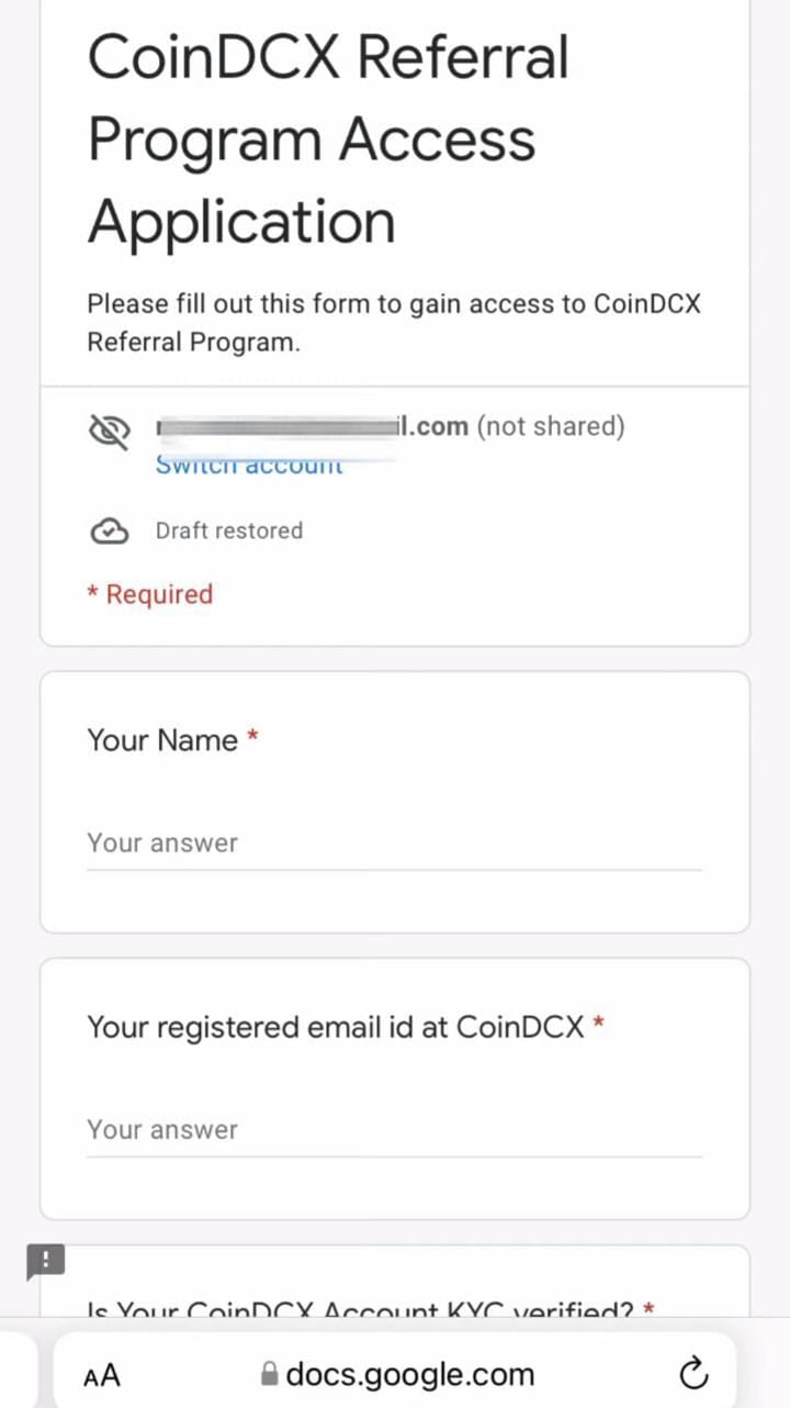 Something like this will open. First of all, you have to enter your email id. After that, you have to enter your full name which is in coindcx, that click on register email id