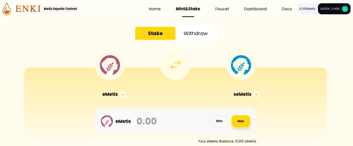 Step 3: Stake eMetis- Next you need to stake the eMetis you have minted to get some seMetis.