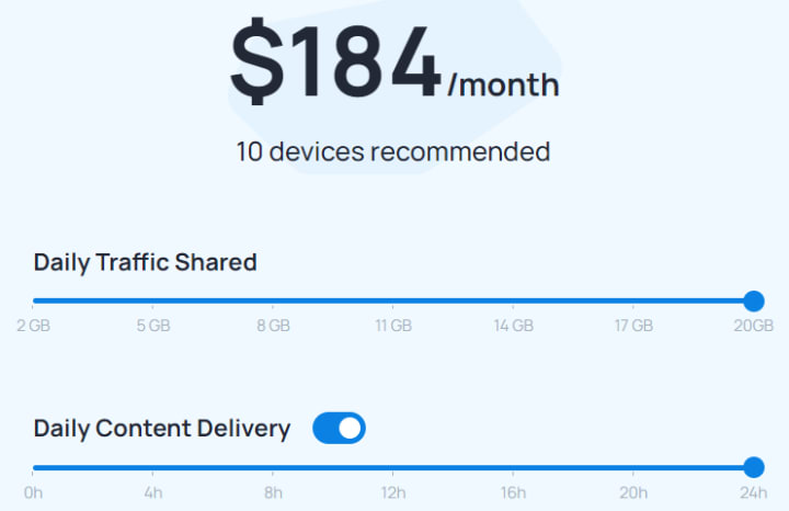 Potentially earn up to $184 per month, with Honeygain running on 10 devices with different IP addresses! However, this is a highly optimistic estimate, and actual earnings vary with the internet connection, geographical location and device performance.