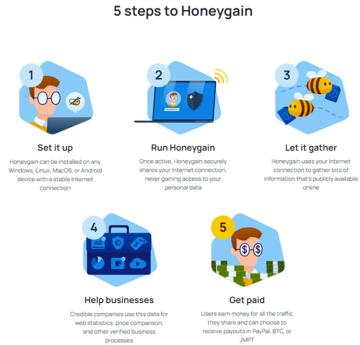 Honeygain is an app that essentially lets you “rent” out your excess internet data to companies for crowdsourced information processing, brand protection campaigns, SEO monitoring, ad-fraud prevention among many other useful purposes. In return, you will be rewarded with cash in the form of Honeygain credits, or cryptocurrency (Bitcoin & JMPT token).