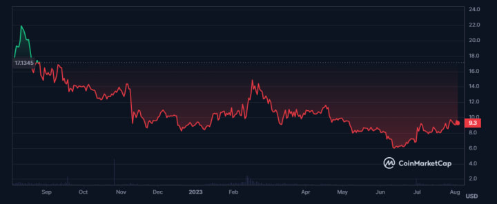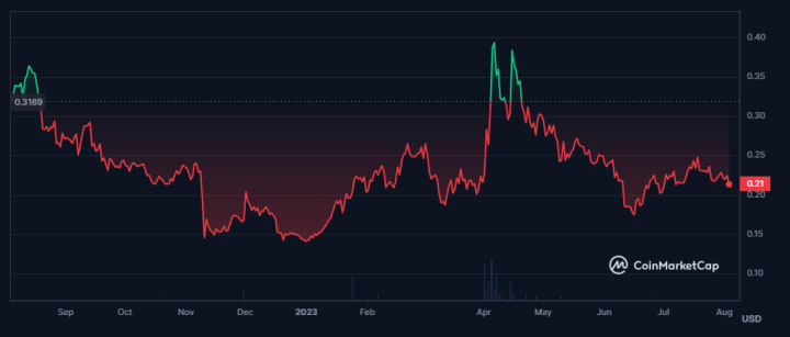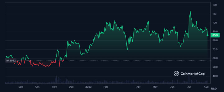 Over the past year, Litecoin's price has exhibited intriguing behavior, experiencing a partial recovery towards the $100 mark. With whales and miners accumulating Litecoin in anticipation of the halving, an opportune moment for re-entry into the market may be on the horizon. Thus, Litecoin is positioned as one of the prominent altcoins to observe in August 2023.