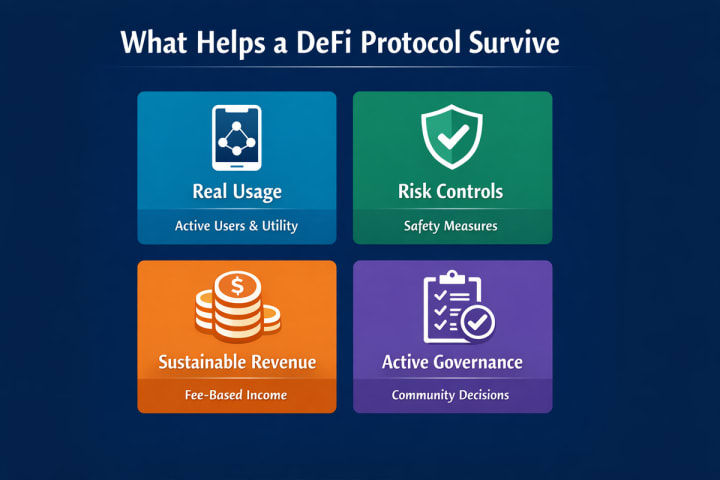 Infographic showing key factors that help DeFi protocols survive including real usage, risk controls, revenue, and governance