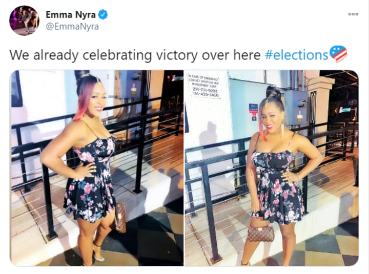 Nigerian singer Emma Nyra dressed up for the occasion already expecting that Joe Biden would win. The singer tweeted saying: