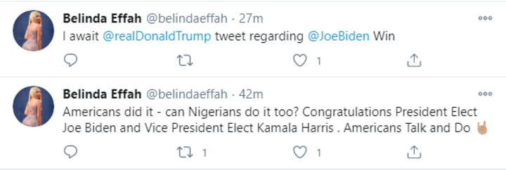 She also tweeted her congratulations to Joe Biden and asked Nigerians to match the energy: