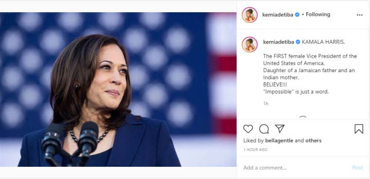 KAMALA HARRIS. The FIRST female Vice President of the United States of America. Daughter of a Jamaican father and an Indian mother. BELIEVE!!! "Impossible" is just a word.