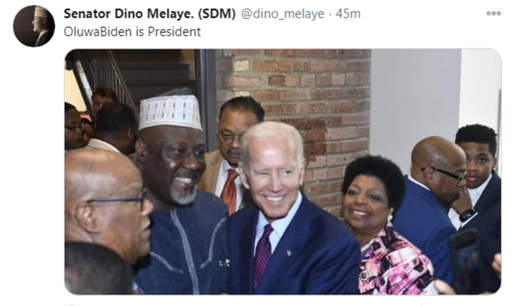 Senator Dino Melaye took to Twitter to celebrate Joe Biden along with a picture of them together saying: