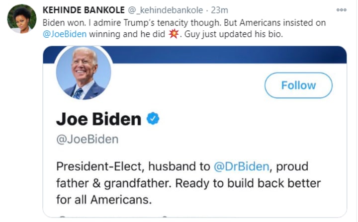 Biden won. I admire Trump’s tenacity though. But Americans insisted on @JoeBiden winning and he did. Guy just updated his bio.