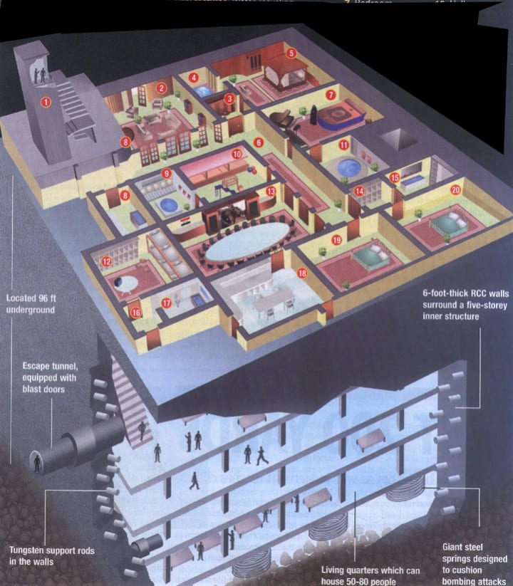 Six foot Reinforced Concrete walls filled with Tungsten rods surround the inner structure which has 5 floors with giant steel springs to absorb bombing attacks.