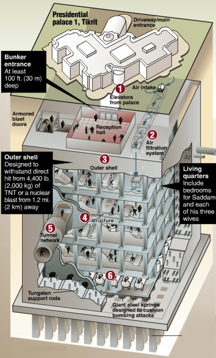 Long Before Hussein was toppled in the American Led invasion, he had many bunkers located around IRAQ, none quite so extreme however, as the one underneath the Presidential Palace in Baghdad.