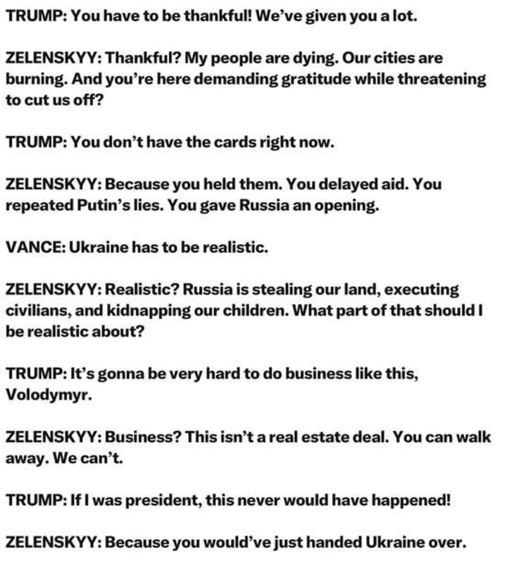 One of the men in that press conference was a decent human and a true leader, but it certainly was not one of the Americans. I have never been more disheartened and embarrassed to be American. More disheartening was watching the man elected to be president speak of the loss of lives in one breath and negotiating and bartering for the US's assistance i the next breath. Our president and vice president are nothing short of schoolyard bullies. Indeed, these are dismal times. I appreciated your well written piece - it is a reminder of the world's anger (and much of America's) in response to this horrific event. It definitely marks a sad day in American history. I stand with Ukraine.