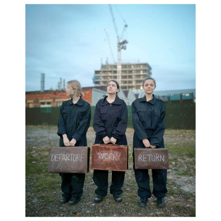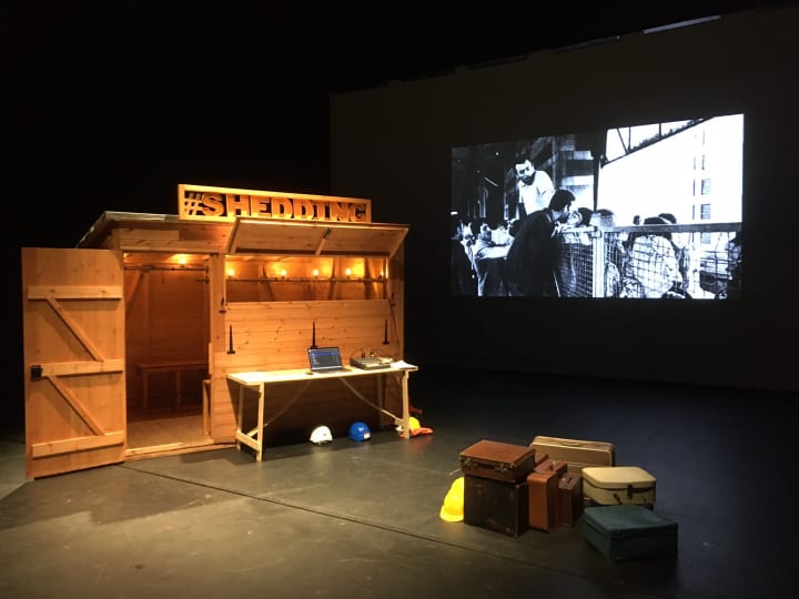 Seven audience members are invited to become migrant workers on this journey. They are met outside by the performers who give them a suitcase before bringing them into the S.H.E.D, which variously becomes a truck, a train, accommodation barracks, a border control post and an overbearing factory. This immersive performance, like the book, concerns a dream/nightmare. The existence of the migrant worker. (Pinchbeck & Smith, 2020: Online)