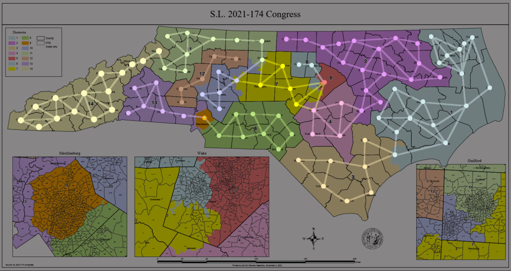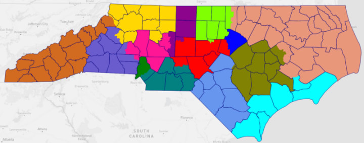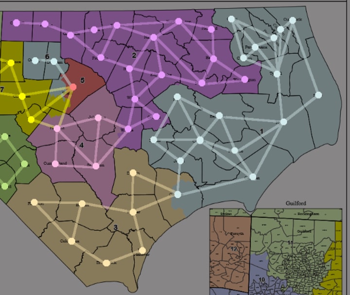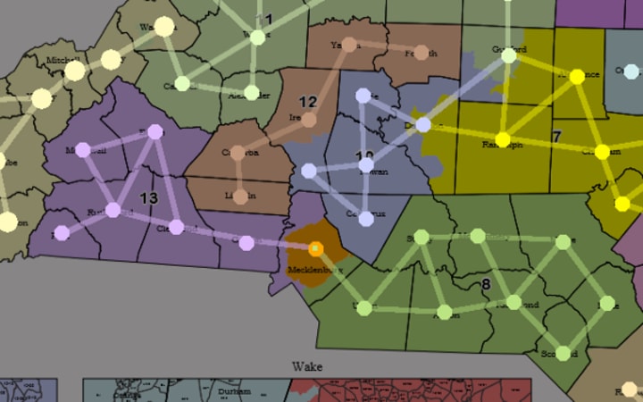 - Many districts converging on a single population center and spreading outwards radially (e.g., as seen with Charlotte, the Triad, and the Triangle).