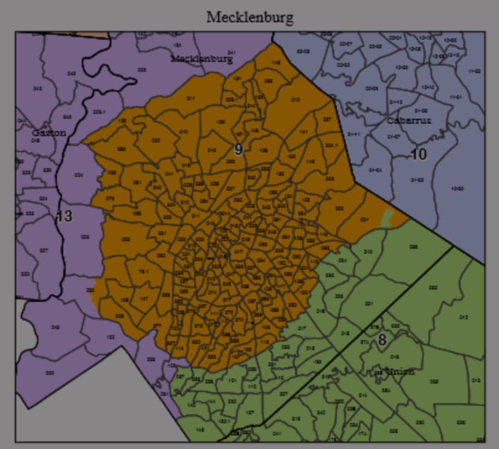 The Charlotte area is split between a total of five districts, as it was in the previous partisan gerrymander; it would be natural to contain Charlotte and its immediate suburbs in three or four districts. These districts stretch from the mountains to Winston Salem to the sandhills — which is to say that they aren’t quite as far-flung as in the previous district map, but still stretch quite far from Charlotte.