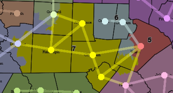There are two red flags here. First is the fact that Wake County is divided into three parts is an immediate red flag. Wake County’s population merits dividing the county into two parts; it does not merit dividing the county into three parts. Second, the 7th district contains no less than four partial counties, sprawling from Thomasville in Davidson County to Morrisville in Wake County.