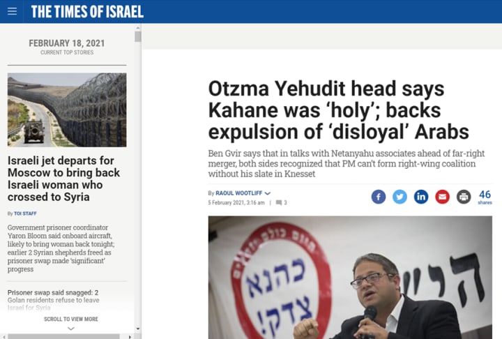 * https://www.timesofisrael.com/otzma-yehudit-head-says-kahane-was-holy-backs-expulsion-of-disloyal-arabs/