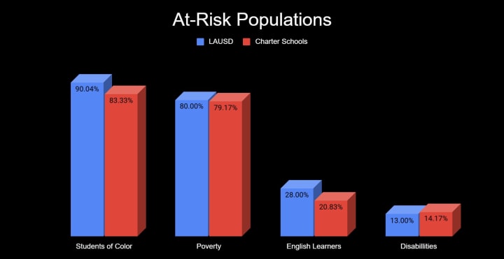 In an attempt to show that “the children attending charter…schools are the same children in District public schools,” Dell'Aquila cited demographic data that showed the publicly funded private schools he represents serve substantial numbers of students from at-risk communities. He omitted that the LAUSD serves a greater percentage of students in three of the four categories he listed, making his schools cheaper to operate as they shift the costs of meeting these responsibilities to LAUSD schools.