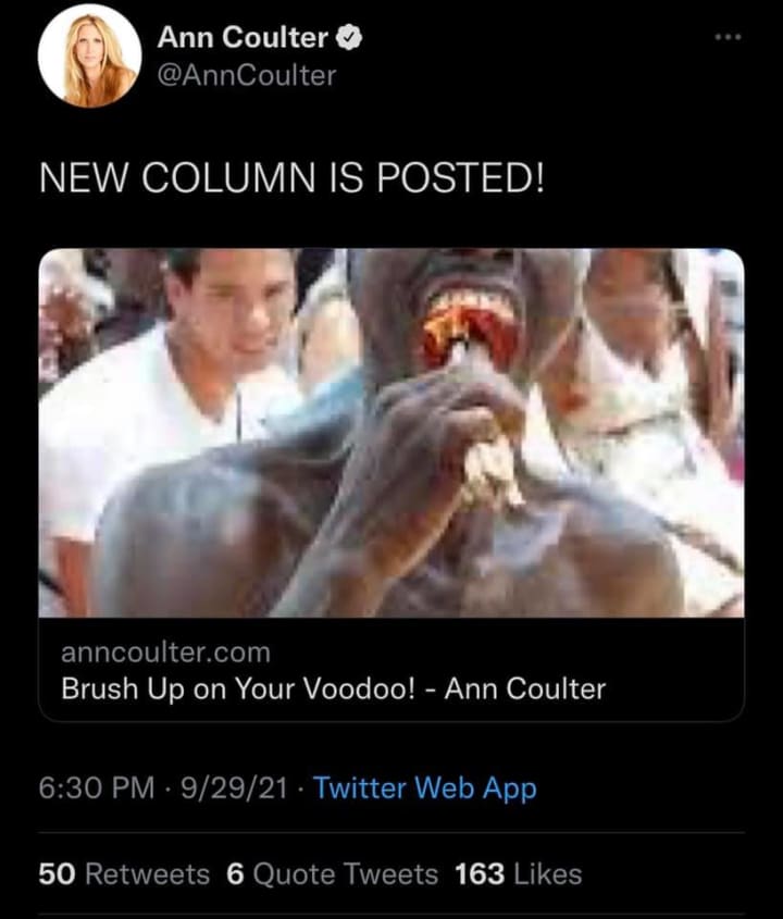 Personally, I think the wail of the bean sidhe was probably just the goats and ponies during mating season, or maybe the Irish setter dogs barking at a fox. But you never know. We all have our superstitions and our folk beliefs, and if Haitian refugees are bringing some here, that is not unusual. It’s also not alarming. Coulter made sure to note that Haitians do strange things in Vodou ceremonies—something about throwing chickens in the air.